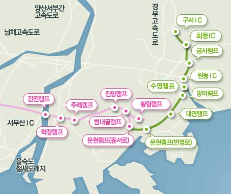 번영로 문현고가, 원동IC, 수영고가, 구서IC 부근의 순입니다.